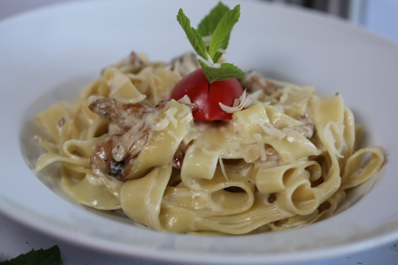 Fettuccine makarna mantar krema tavuk (100 gr) tereyağı ve parmesan. / Fettuccine pasta mushrooms cream chicken (100 g) butter and parmesan.