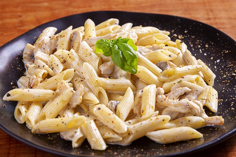 Penne makarna kremalı tavuk ve mantar. / Creamy chicken and mushroom penne pasta.